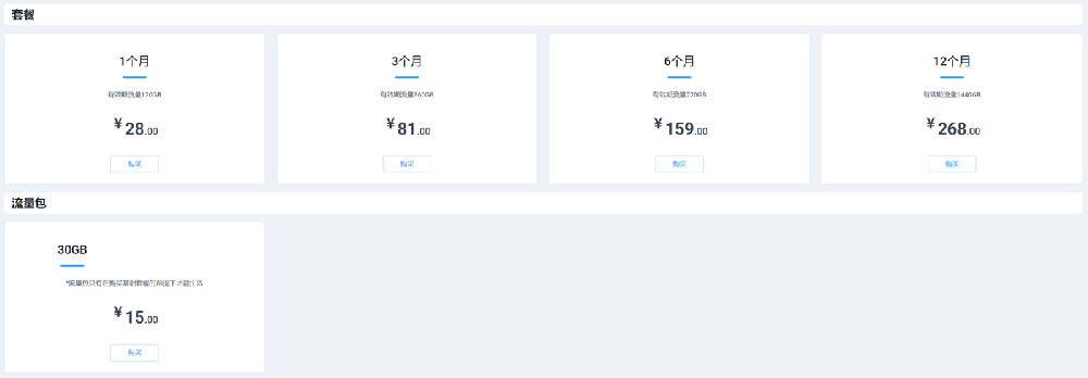月套餐28元120GB;季套餐81元360GB;半年套餐159元720GB;年套餐268元1440GB(只能在网站购买)